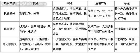 1.2.2 不銹鋼表面鏡面光亮處理方法:根據(jù)不銹鋼產(chǎn)品的復(fù)雜程度和用戶要求情況不同可分別采用機械拋光、化學(xué)拋光、電化學(xué)拋光等方法來達到鏡面光澤。這三種方法優(yōu)缺點如下: